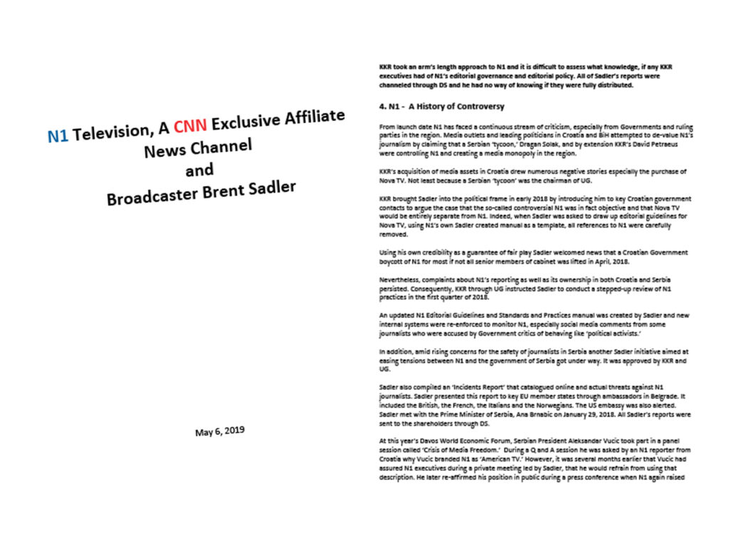 To su okolnosti u kojima je do Nacionala, usred velike bitke za ključni utjecaj na uređivačku politiku N1 televizije u Srbiji tijekom velikih studentskih prosvjeda protiv Aleksandra Vučića, dospio i interni Sadlerov izvještaj o pokušajima utjecaja administracije hrvatskog premijera Andreja Plenkovića na većinske vlasnike Nove TV u Hrvatskoj.